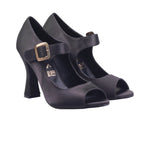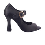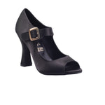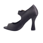 El tacón de 9.00 cm tiene forma acampanada, más ancho en la base que en la parte superior, lo que mejora la estabilidad y añade un toque retro al perfil estilizado. La plantilla está ligeramente acolchada en tono neutro, complementando el diseño con discreción.