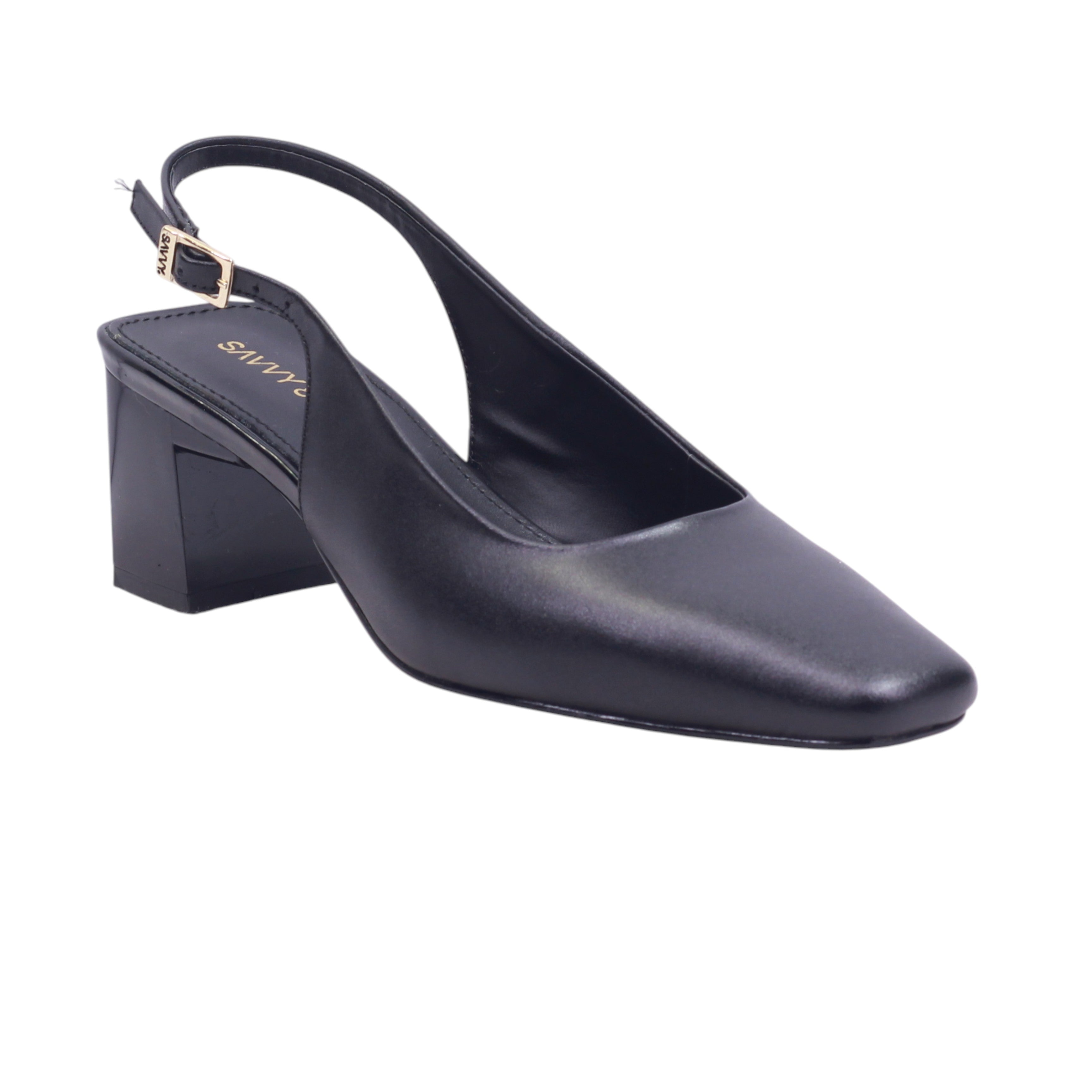 Zapatilla acharolado tipo slingback con tacón alto y diseño estilizado