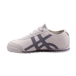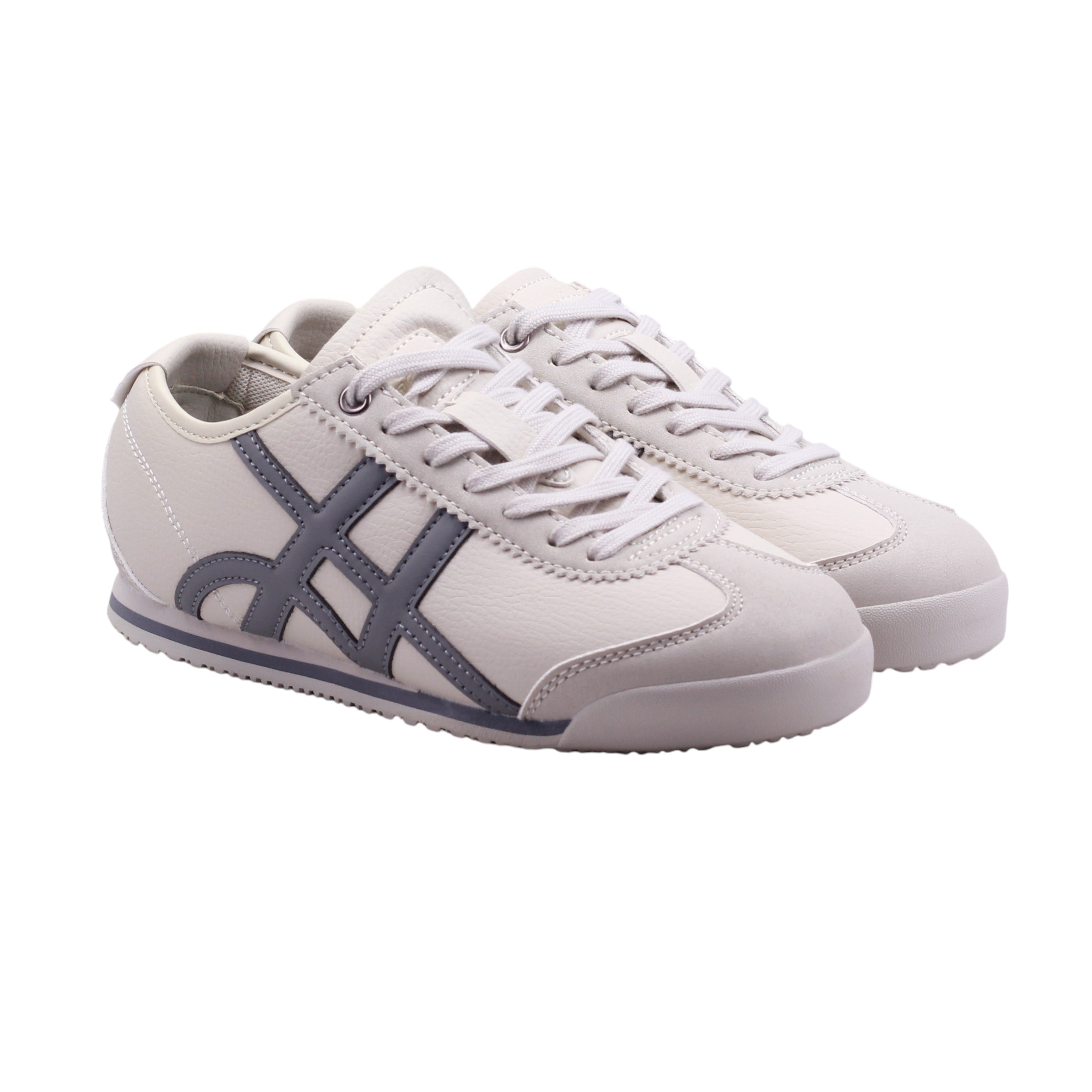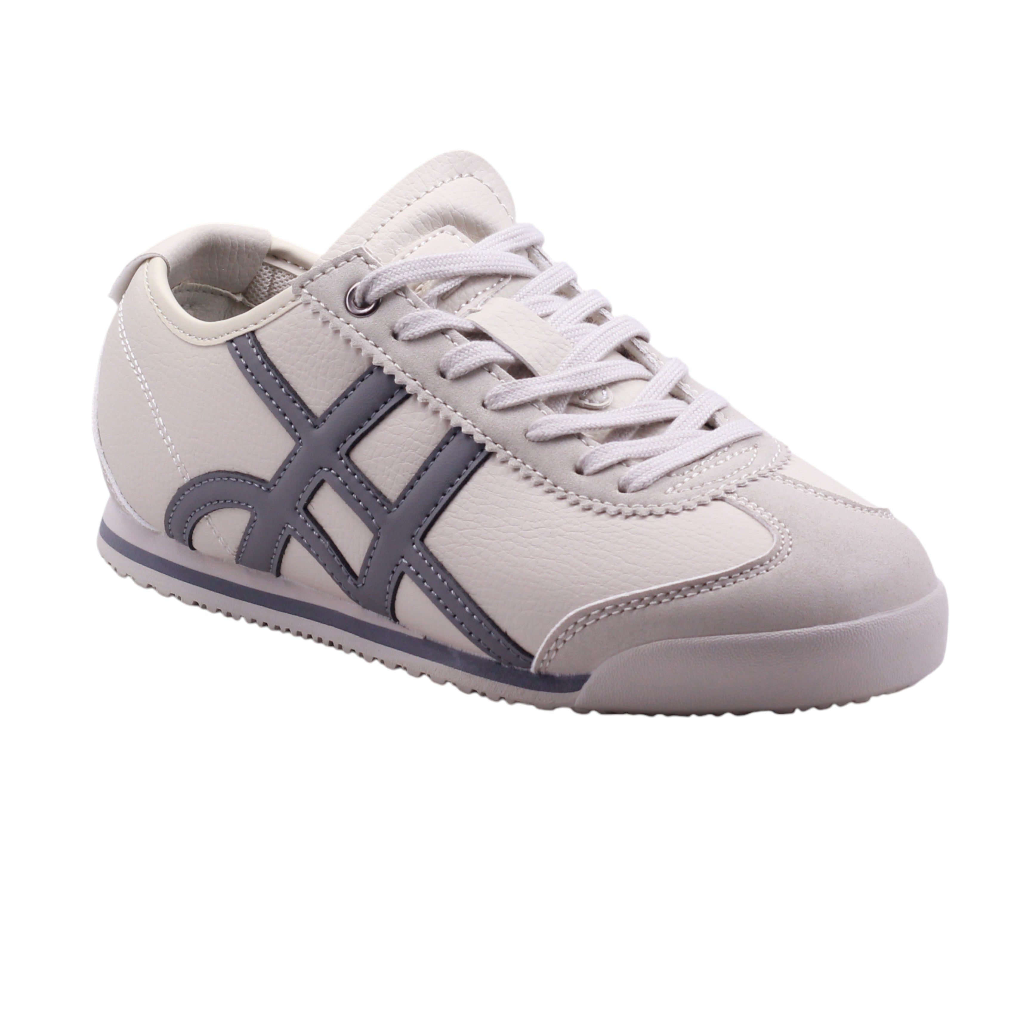 El diseño presenta una silueta de perfil bajo en tono neutro, con superficie lisa y detalles de costura que aportan estructura sin saturar el diseño. El lateral incluye franjas en contraste que añaden dinamismo visual, mientras que el ajuste con agujetas blancas permite un calce personalizado. La puntera perforada mejora la ventilación, y el cuello ligeramente acolchado brinda comodidad adicional.
