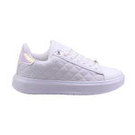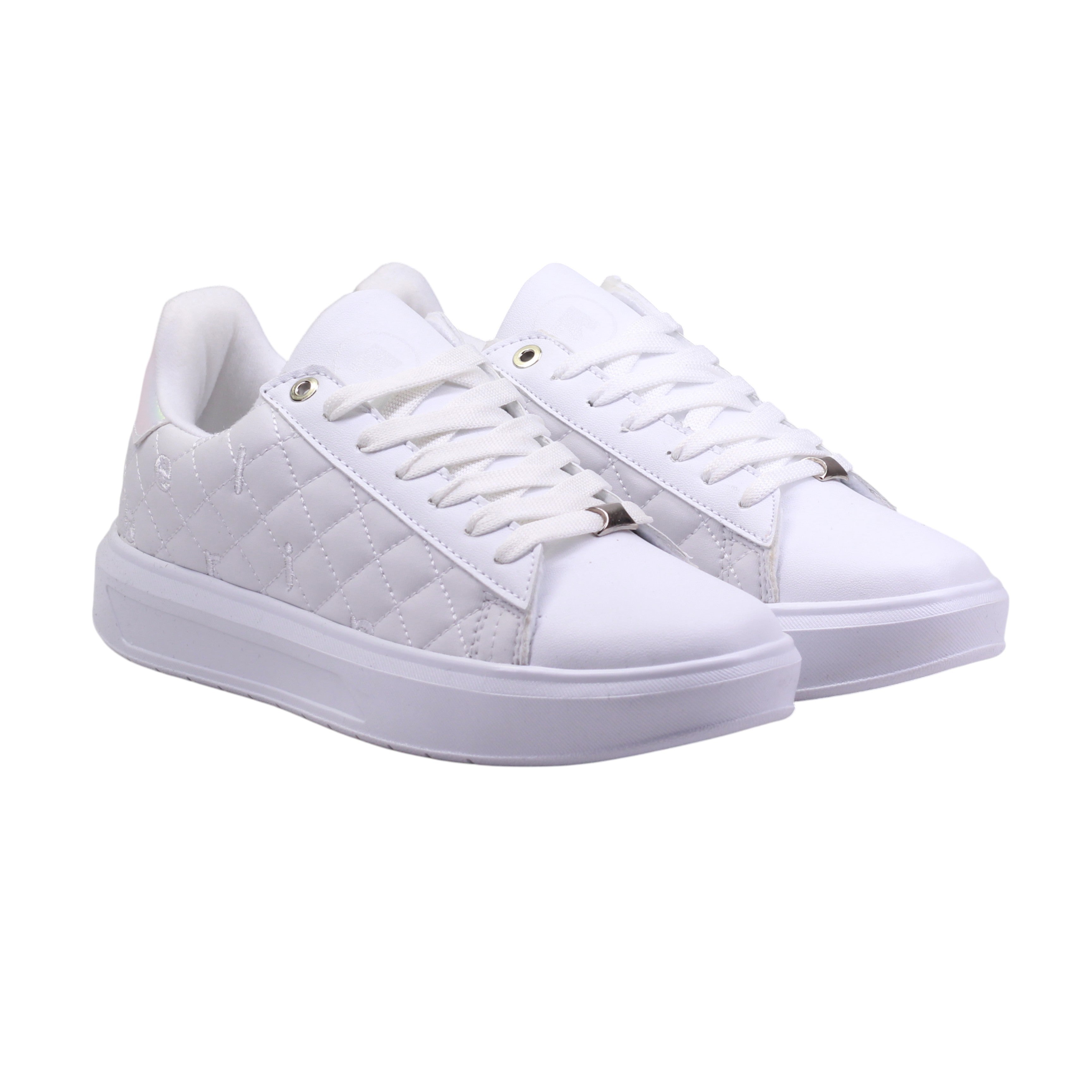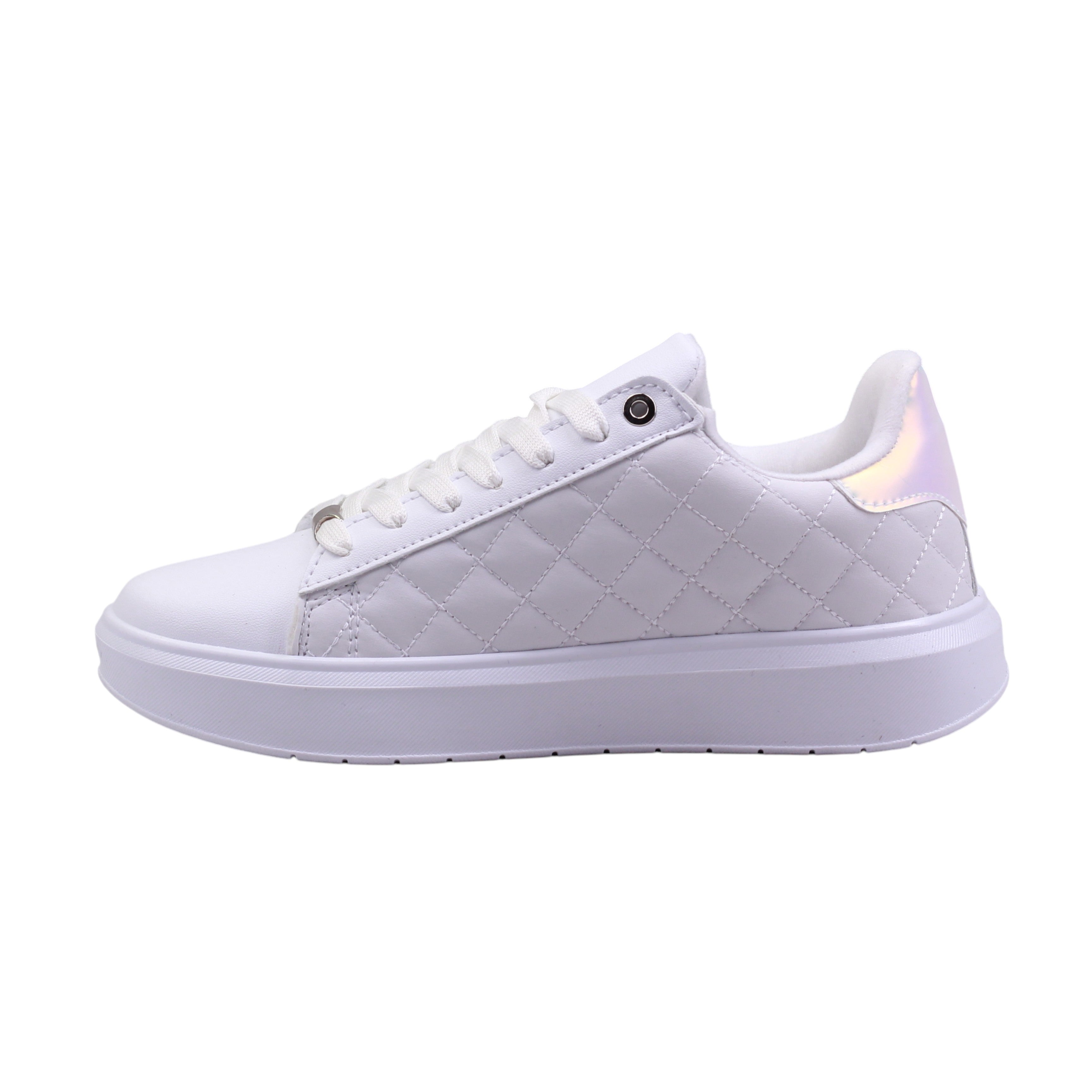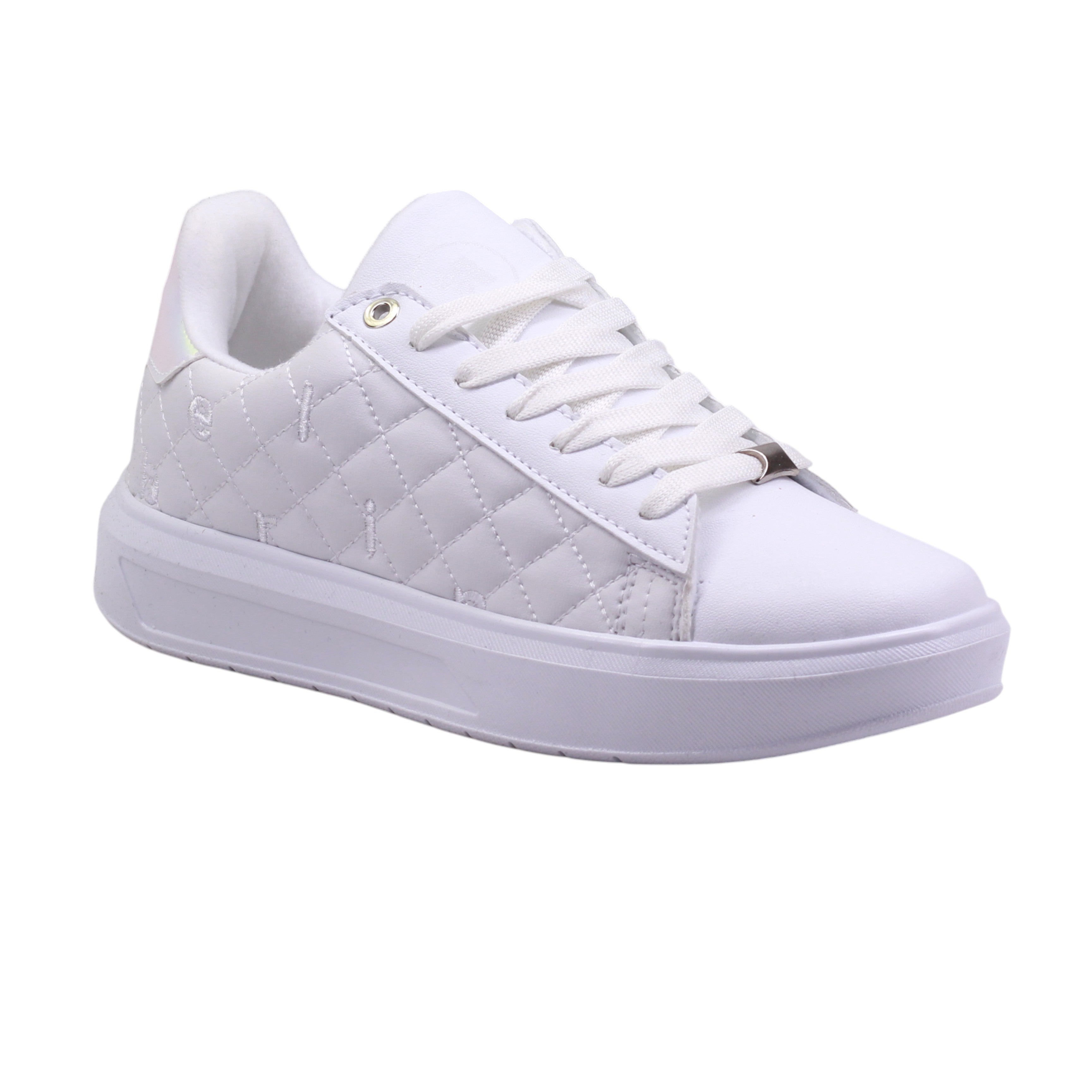 El diseño destaca por su panel lateral acolchado con patrón tipo capitonado, que aporta textura y sofisticación al conjunto. El ajuste es mediante agujetas blancas, reforzadas con ojillos metálicos que añaden durabilidad y un toque decorativo. En la parte trasera, el talón incluye un detalle iridiscente o metálico que contrasta con el blanco del resto del calzado, creando un punto focal llamativo.