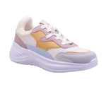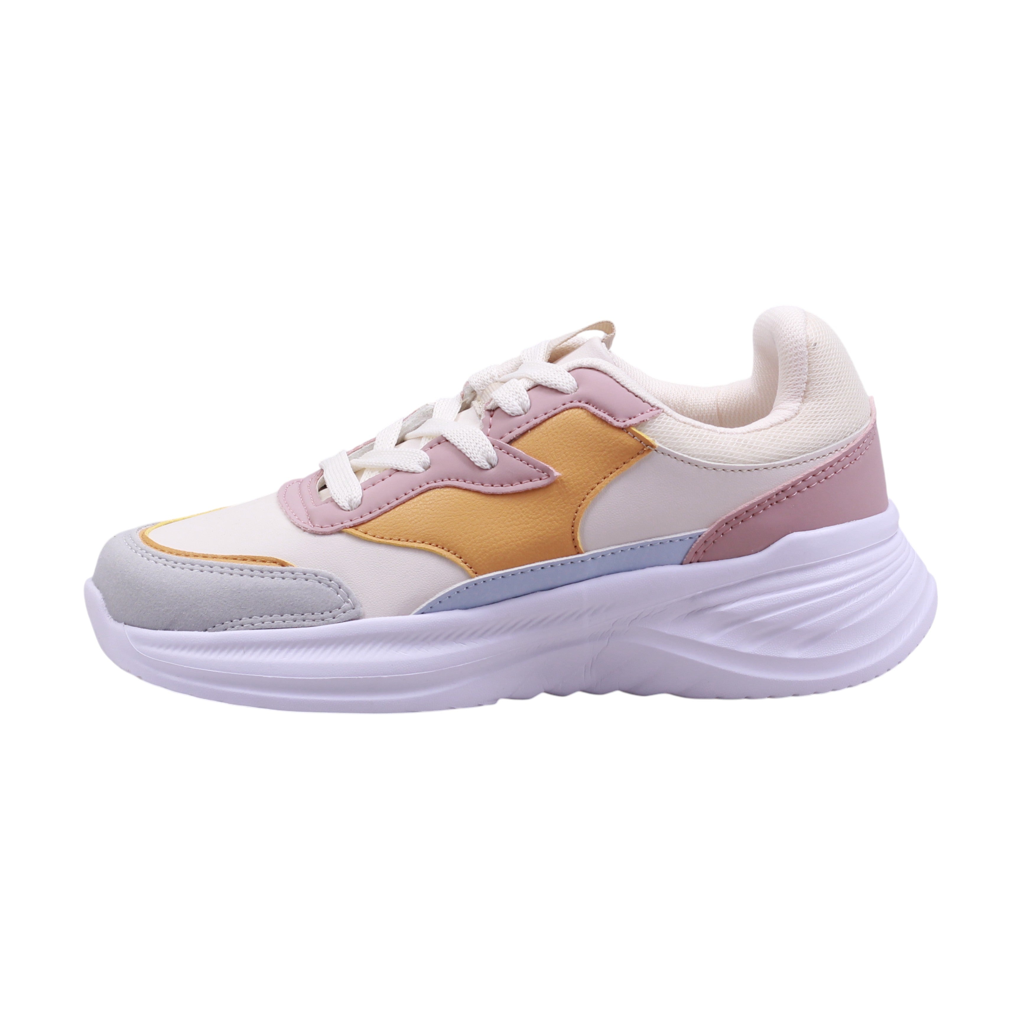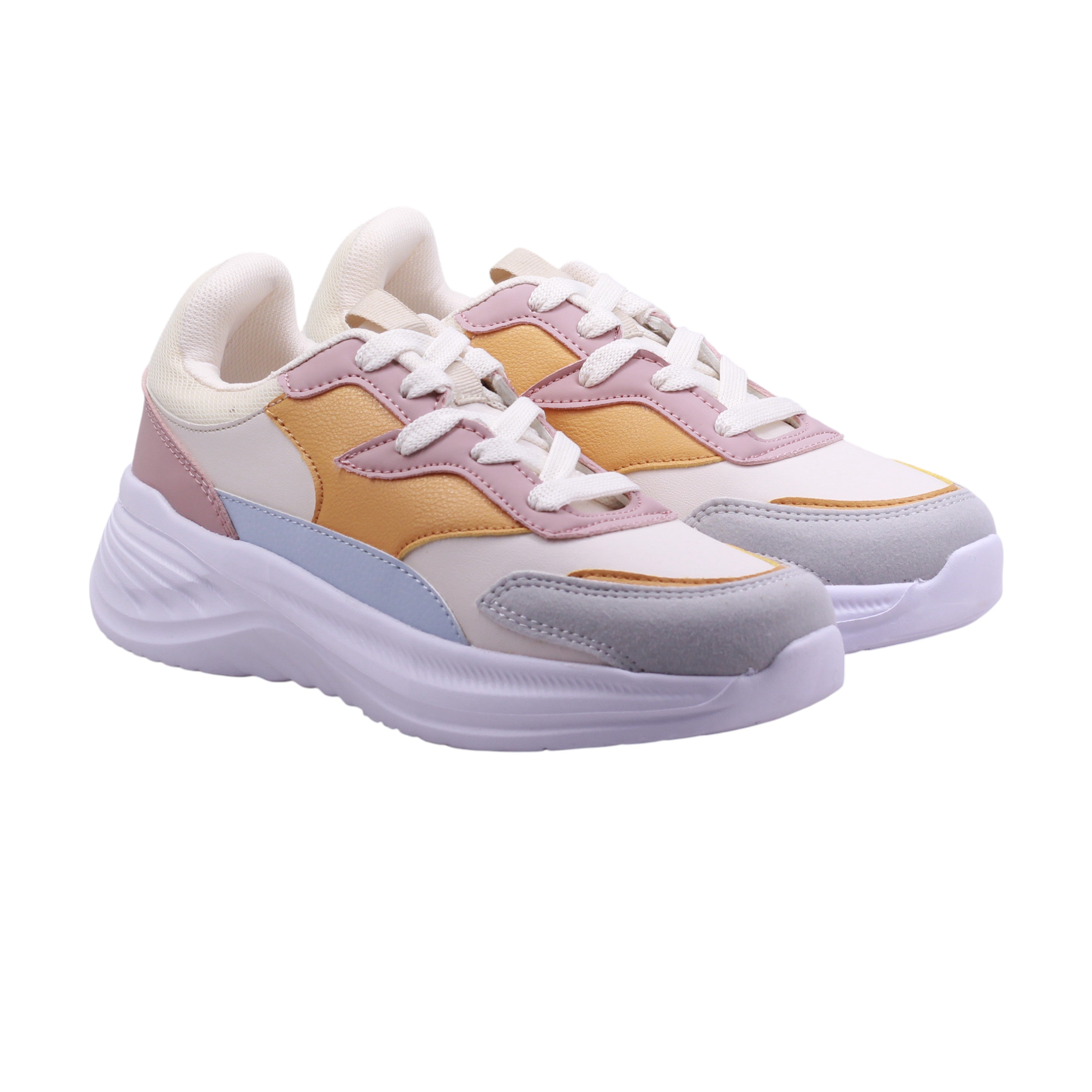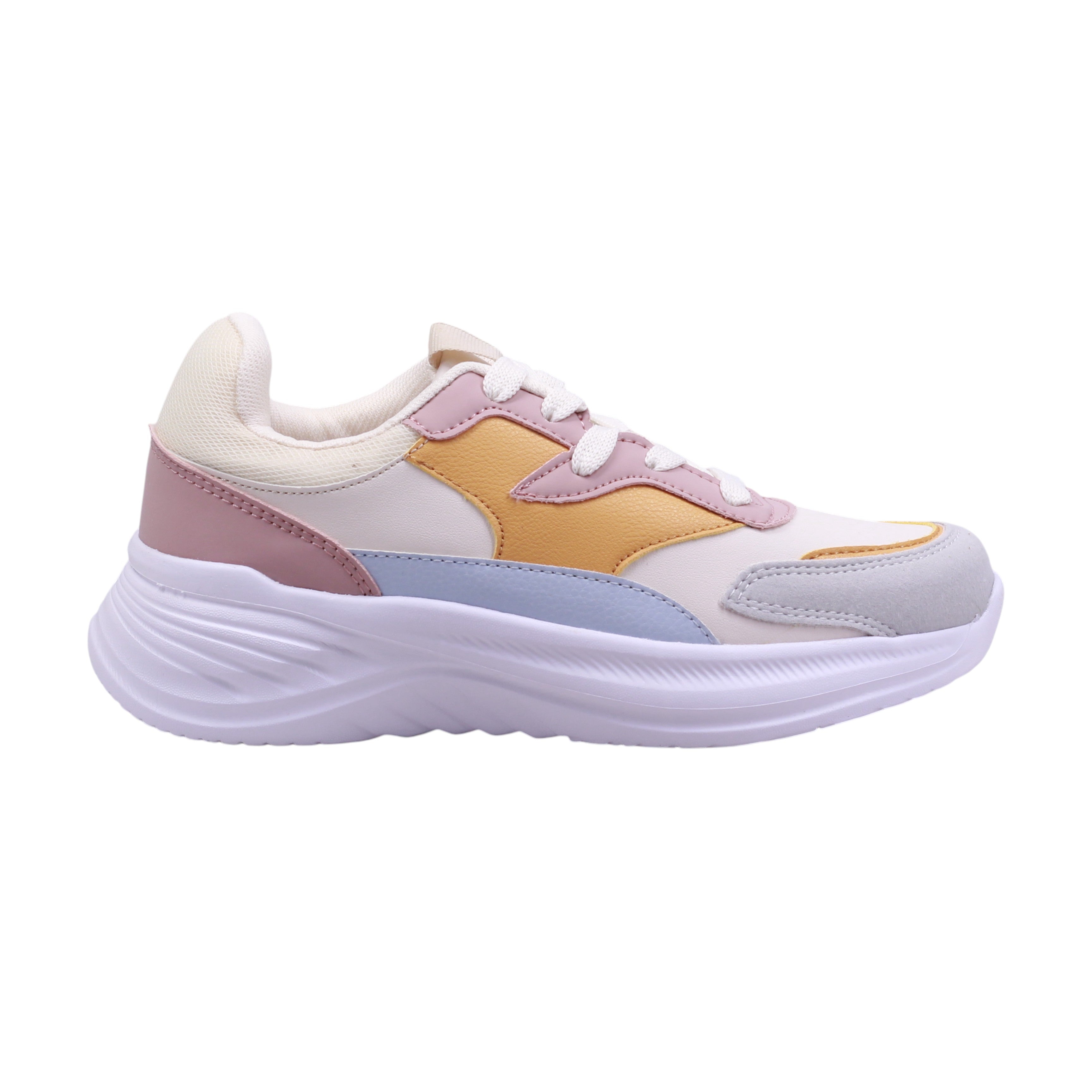 El diseño destaca por su mezcla vibrante de colores pastel y neutros: rosa suave, lavanda, azul cielo, amarillo mostaza, blanco y gris claro, distribuidos en capas que crean profundidad visual. La combinación de materiales como malla transpirable y paneles sintéticos aporta textura y frescura, mientras que los cordones blancos y el cuello acolchado aseguran un ajuste cómodo.