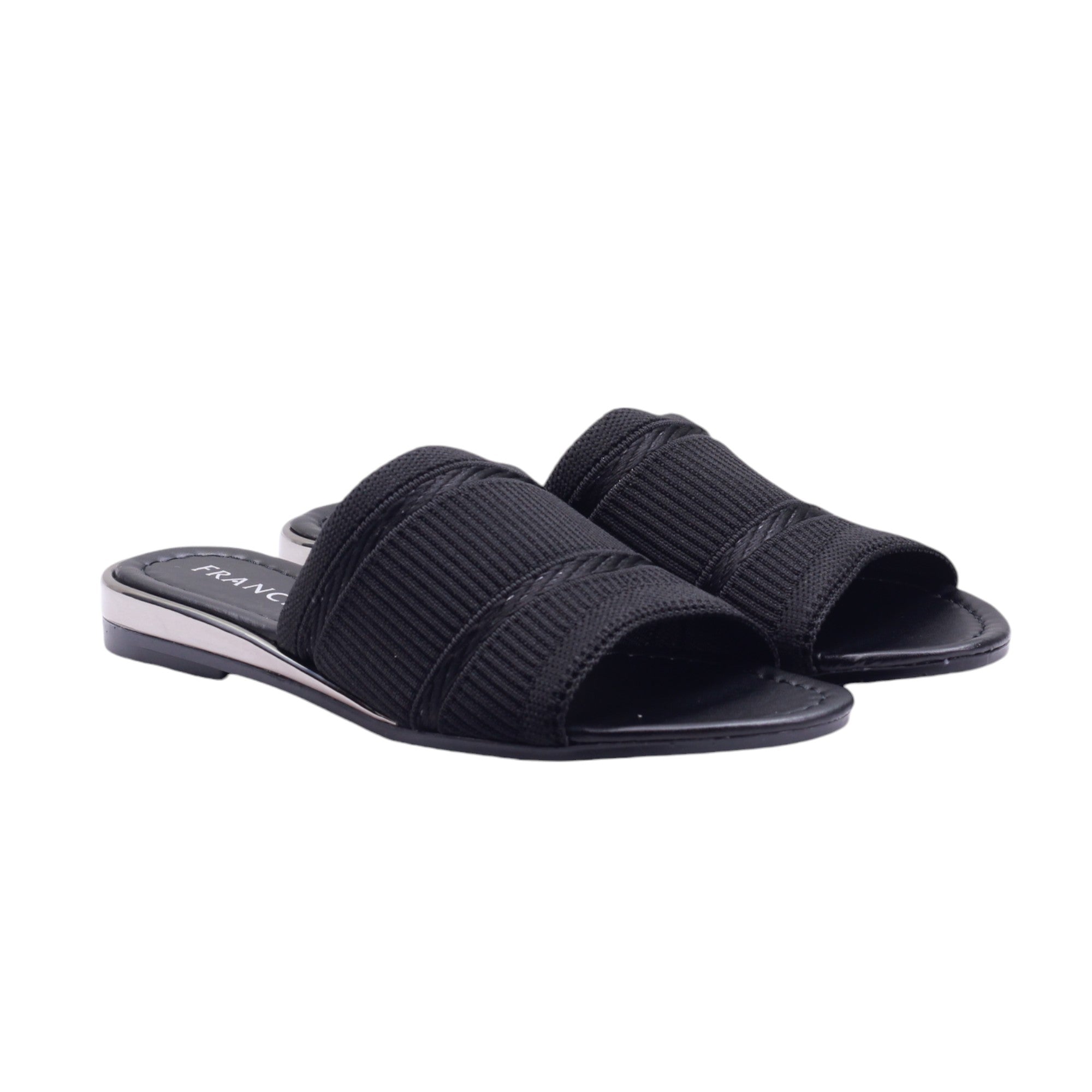 Calzado para dama marca Francis es colores dore y negro. Sandalia tipo slide con diseño minimalista y moderno. Cuenta con una suela tipo plataforma de 2.00 cm de altura, elaborada en material texturizado con costuras decorativas visibles que aportan un toque artesanal. La parte superior está hecha de material textil tipo elástico acanalado, que brinda un ajuste suave y adaptable al pie. Su interior está forrado para mayor comodidad al contacto con la piel.