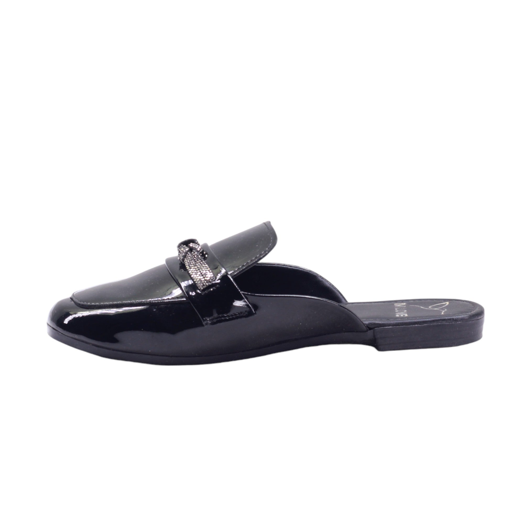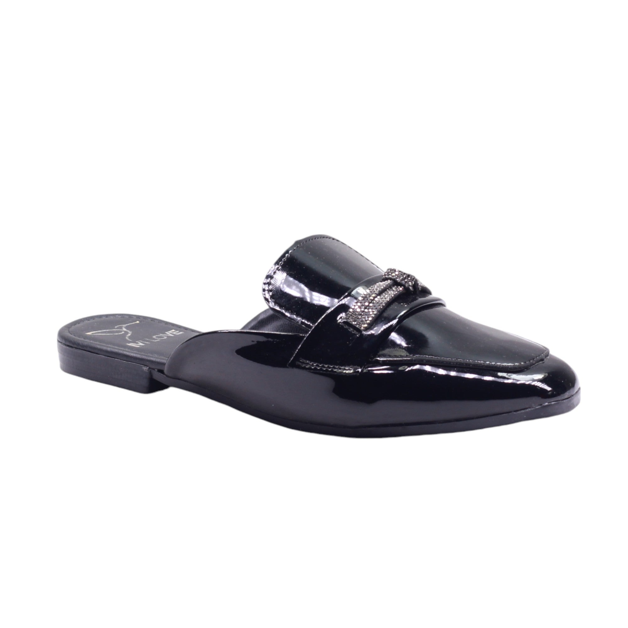 Calzado para dama marca Ivi Love en color negro. Este elegante modelo de metedera cuenta con un acabado de charol que le da un toque de sofisticación. Además, está adornado con una exquisita tira cubierta en pedrería que lo convierte en el accesorio perfecto para cualquier ocasión. Experimenta lujo y estilo con esta pieza única.