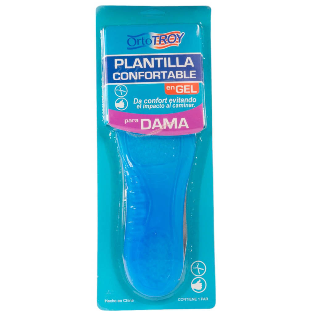 Plantilla de gel para dama marca Troy. Esta plantilla es recortable y está diseñada para brindar mayor confort y absorber el impacto al caminar. Tiene ajuste al calzado, comodidad para el talón y reduce el mal olor. Ideal para cualquier zapato cerrado