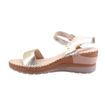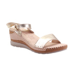 Sandalia para dama marca Riposella en color oro. Diseño elegante con enfoque en confort y materiales premium. Esta sandalia está confeccionada en piel vacuna en el corte, con forro porcino que aporta suavidad y frescura al contacto con la piel. El modelo presenta una estructura abierta con punta redondeada, ideal para climas cálidos y atuendos casuales con un toque sofisticado.