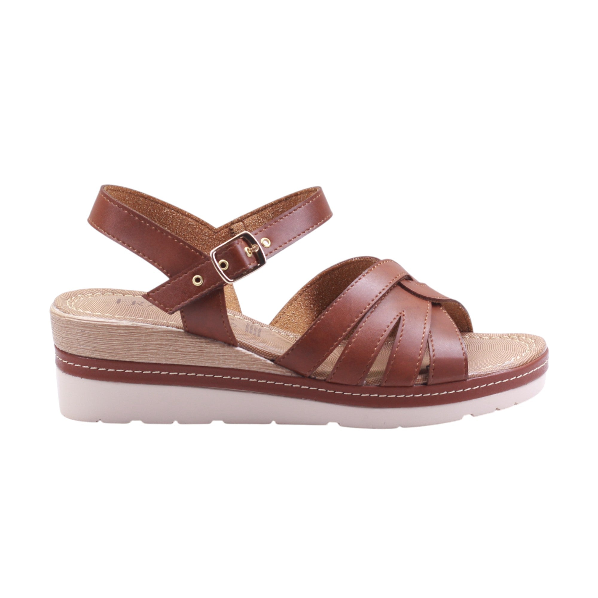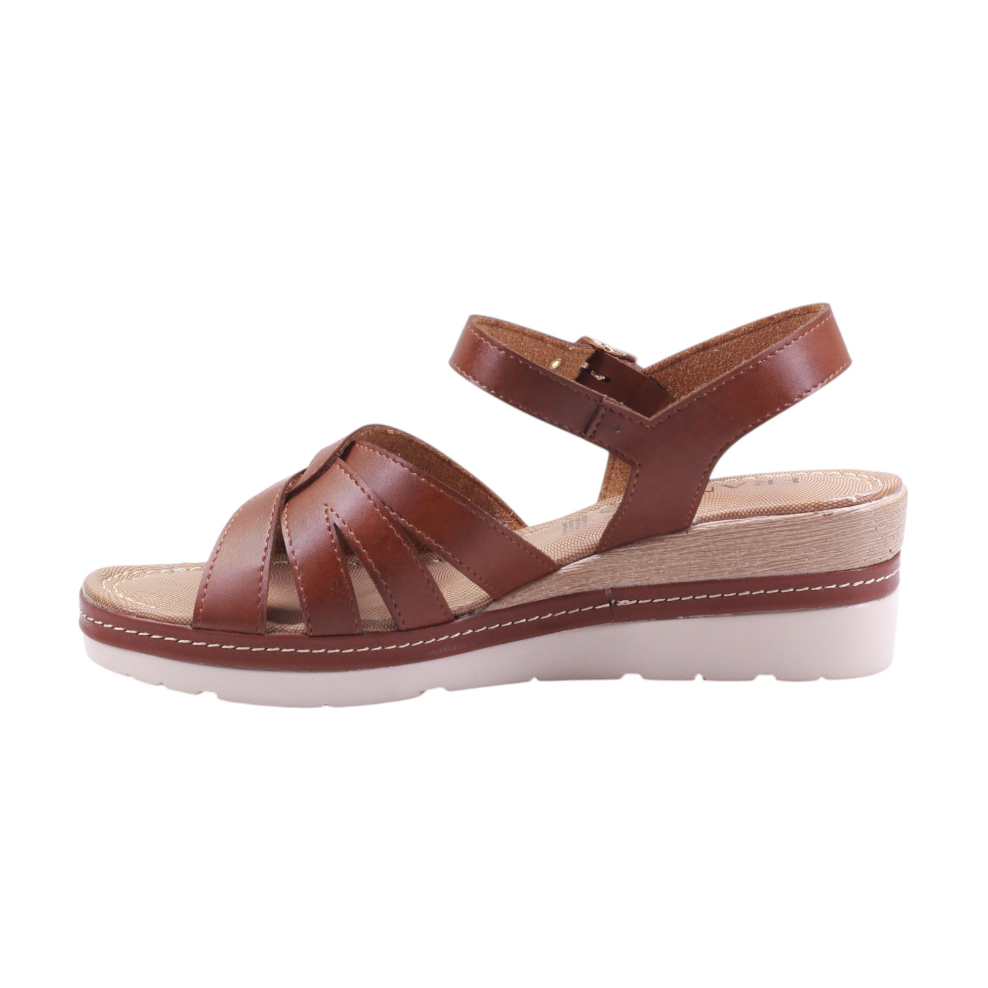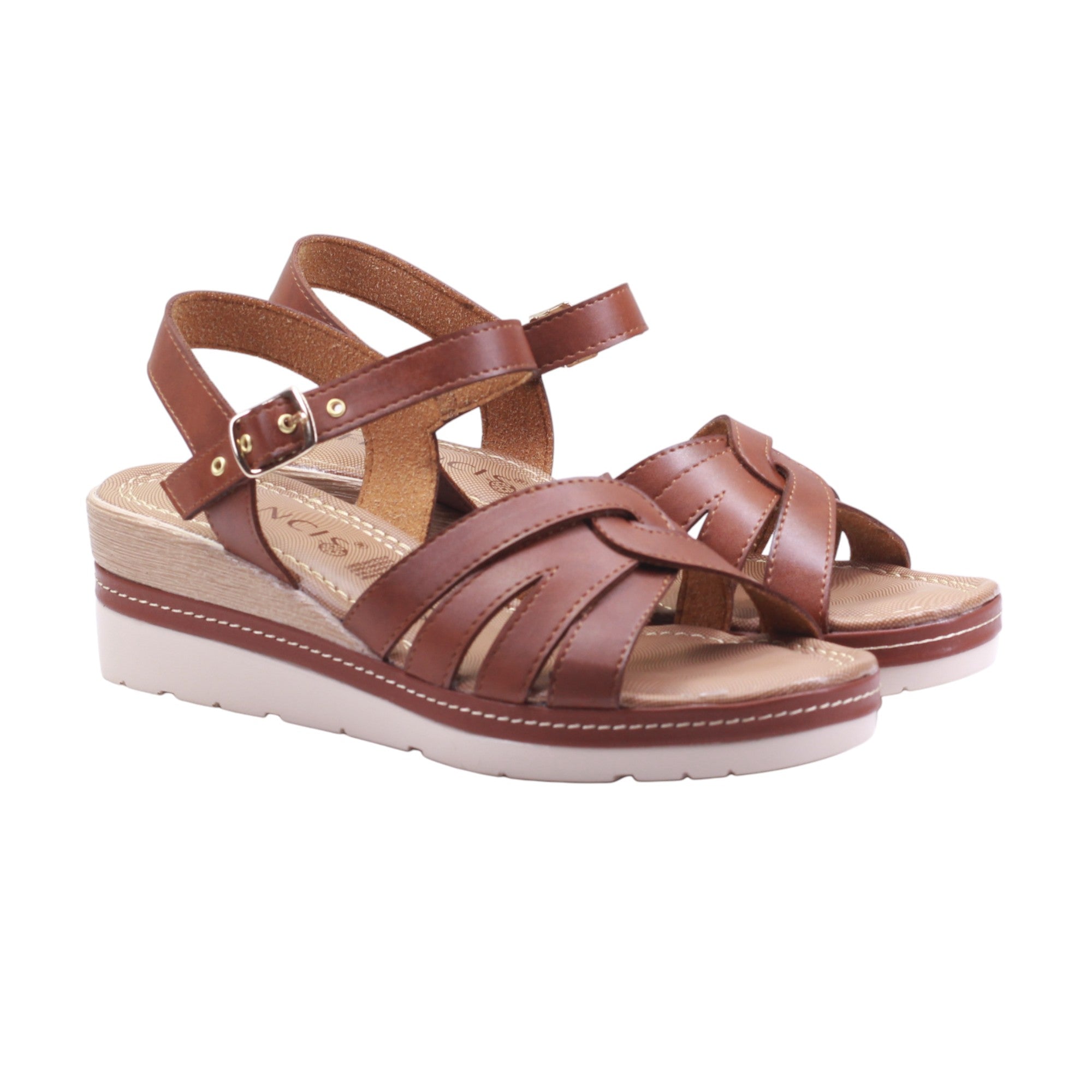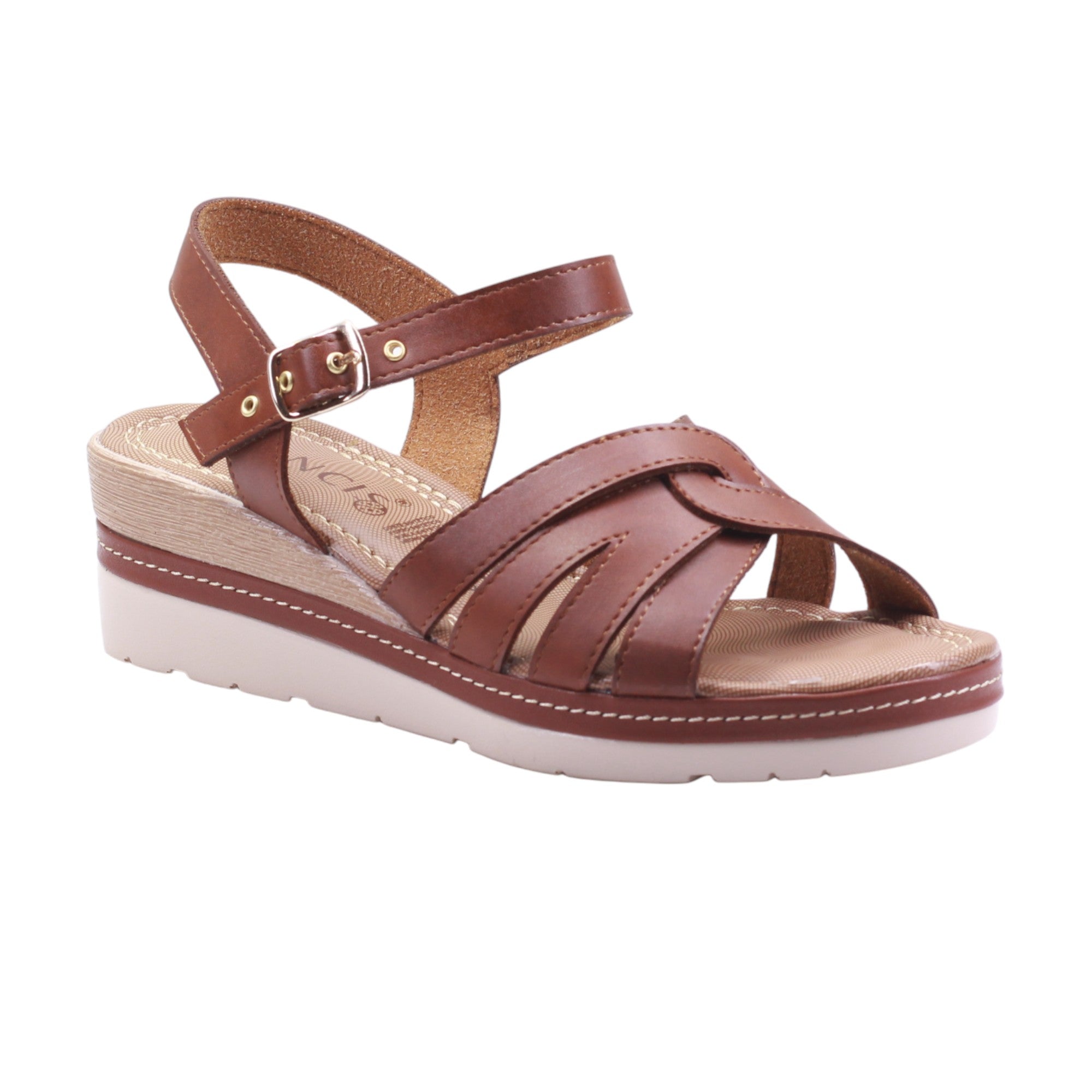 Plataforma para dama marca Francis en color meloso. Esta sandalia combina estructura y estilo en un diseño que estiliza sin sacrificar confort. El corte y forro de piel artificial en tono café cálido aportan una sensación natural y adaptable a múltiples looks. Las tiras frontales se cruzan con elegancia sobre el empeine, brindando soporte visual y físico, mientras que la tira al tobillo con hebilla metálica ajustable asegura un calce firme y personalizado.