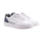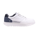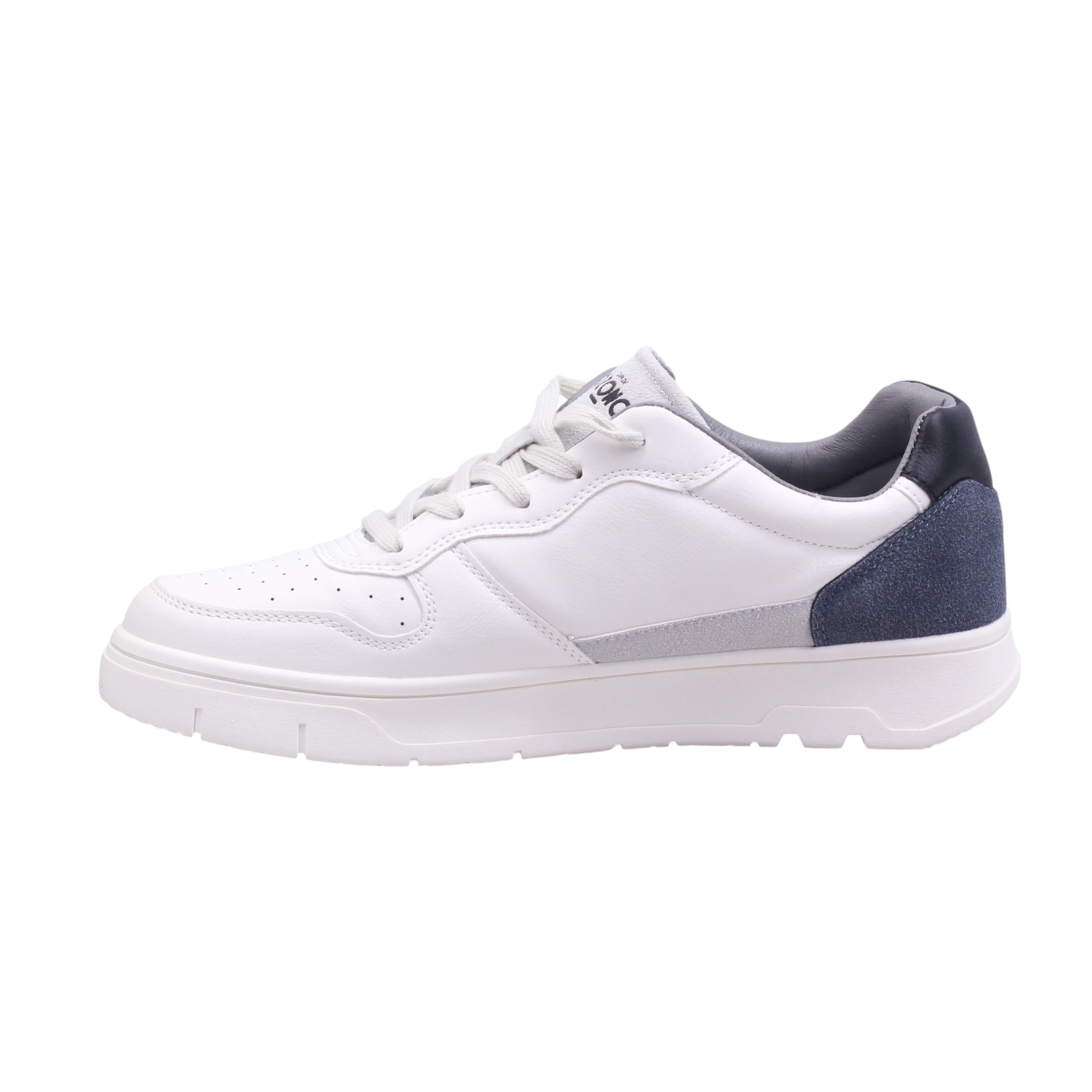 El diseño combina una base blanca con detalles en gris y azul marino, creando un contraste moderno y versátil. La parte frontal incluye perforaciones para mejorar la ventilación, mientras que el talón está reforzado con material texturizado en tono azul, aportando durabilidad y un toque visual distintivo. El ajuste es mediante agujetas blancas, y el cuello acolchado brinda soporte adicional.