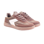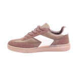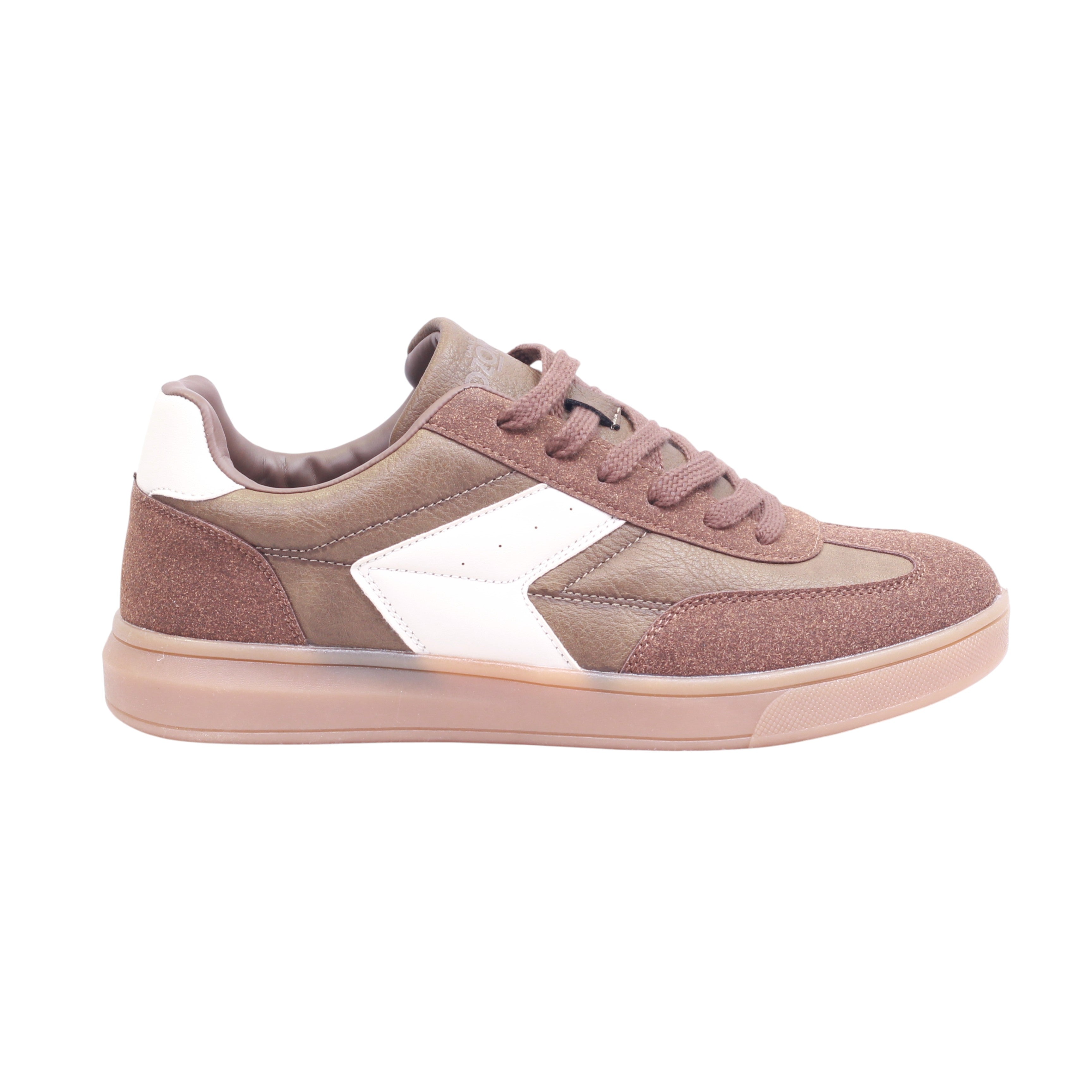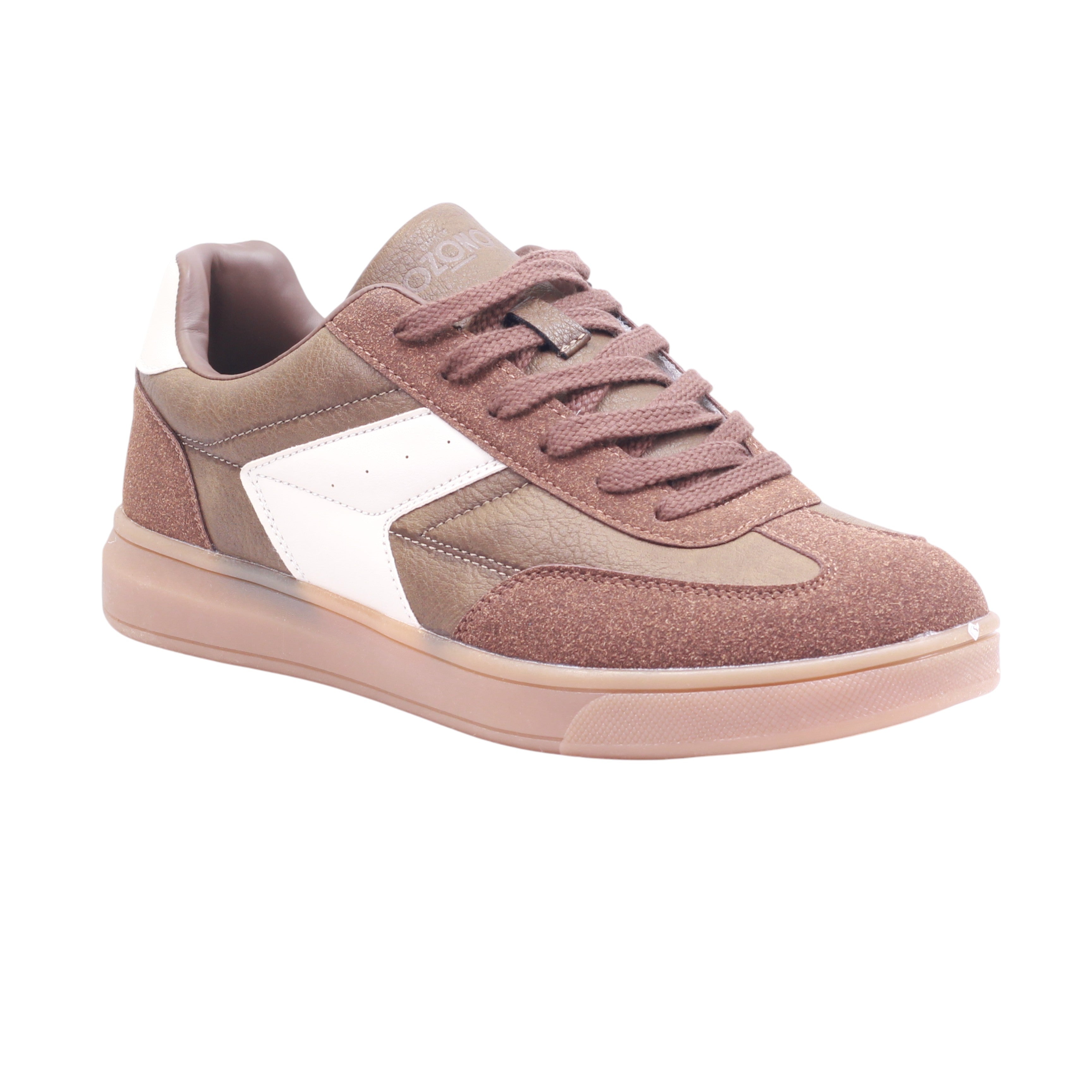 El diseño combina paneles en tono café con acabados tipo gamuza y piel sintética, creando un contraste de texturas que aporta profundidad visual. El lateral incluye una pieza blanca en forma geométrica que rompe con la monocromía y añade dinamismo al conjunto. Las agujetas en tono café y el cuello ligeramente acolchado aseguran un ajuste cómodo y firme.